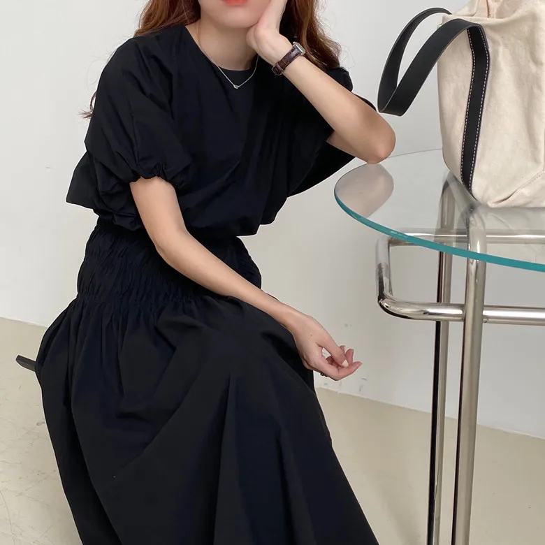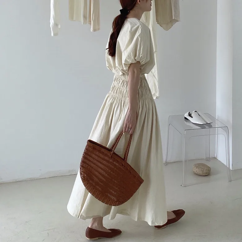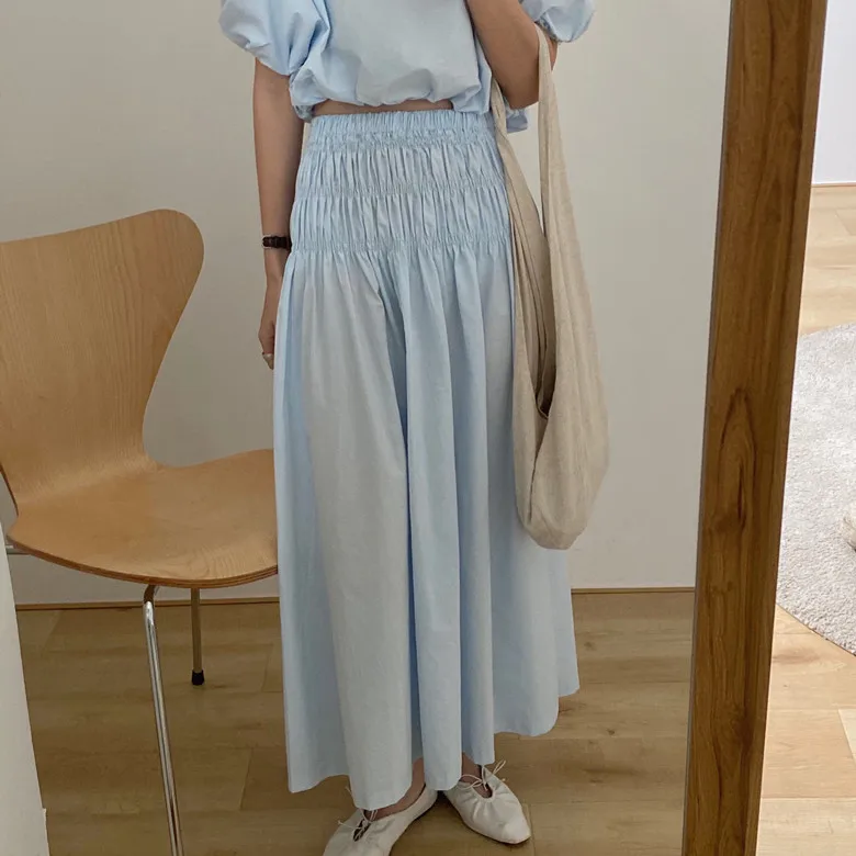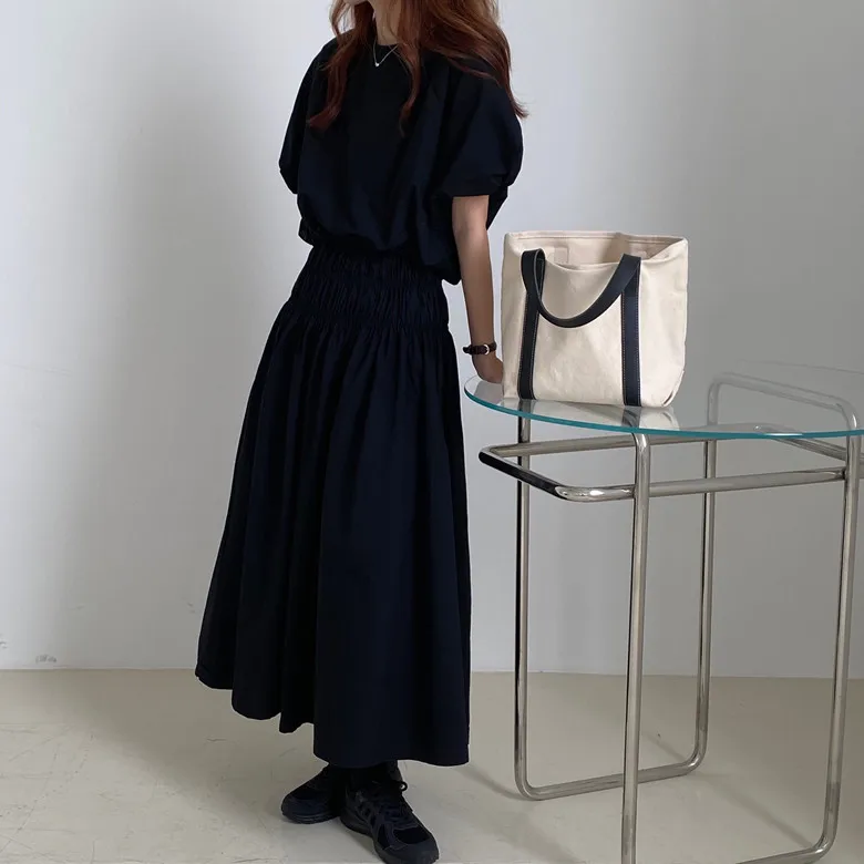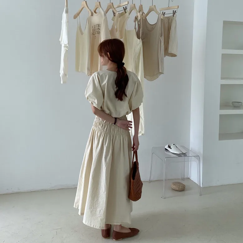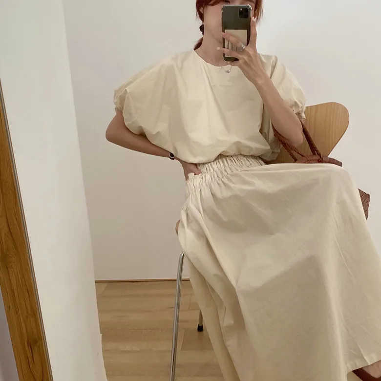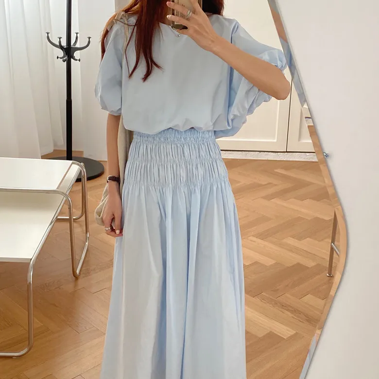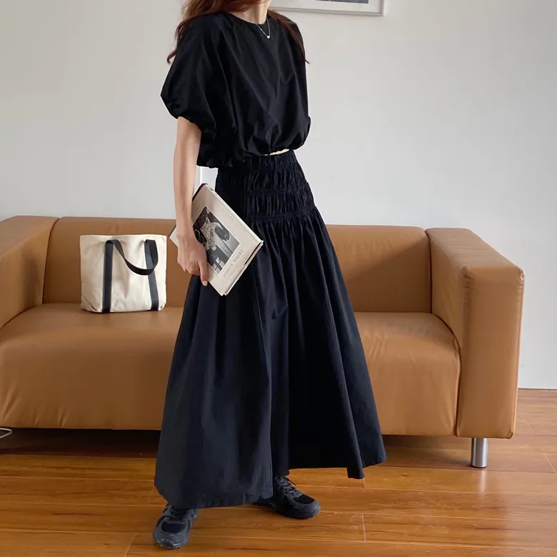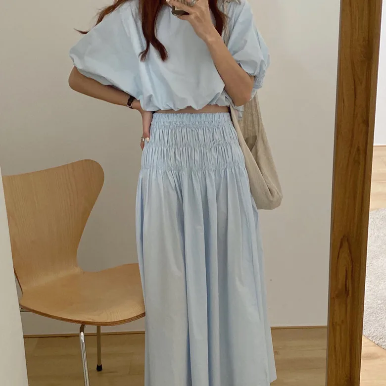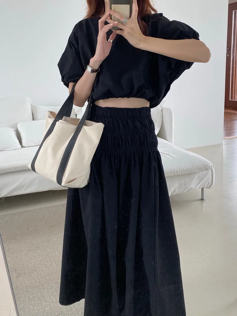 Vintage Women's Puff-sleeve Top and Pleated Long A-line Skirt